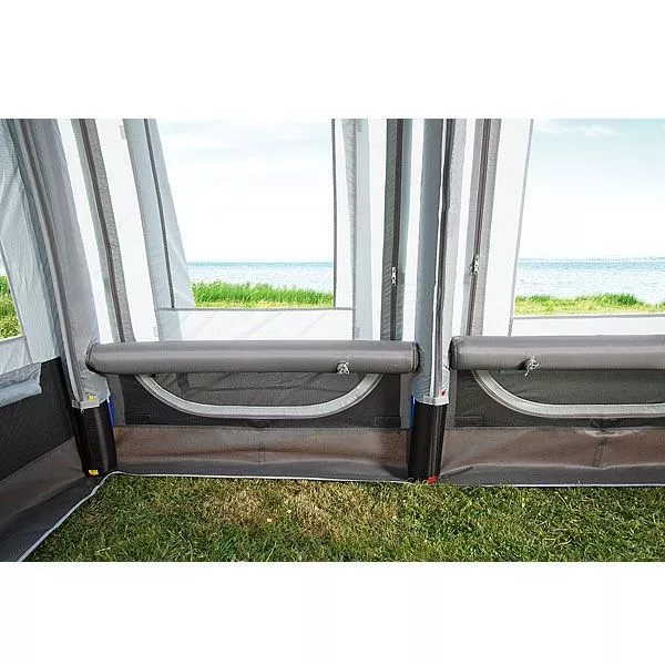 Das als Zubehör erhältliche Distanzpolster-Set wird mit Klettverschlüssen befestigt und spannt das Dach in die Breite für mehr Stabilität. Unterhalb der Vorderwand-Fenster befestigt, sorgt es für noch mehr Stabilität. Der ebenfalls optional bestellbare Innenhimmel sorgt für ein angenehmeres Raumklima im Vorzelt und senkt gleichzeitig die Innenraumtemperatur.