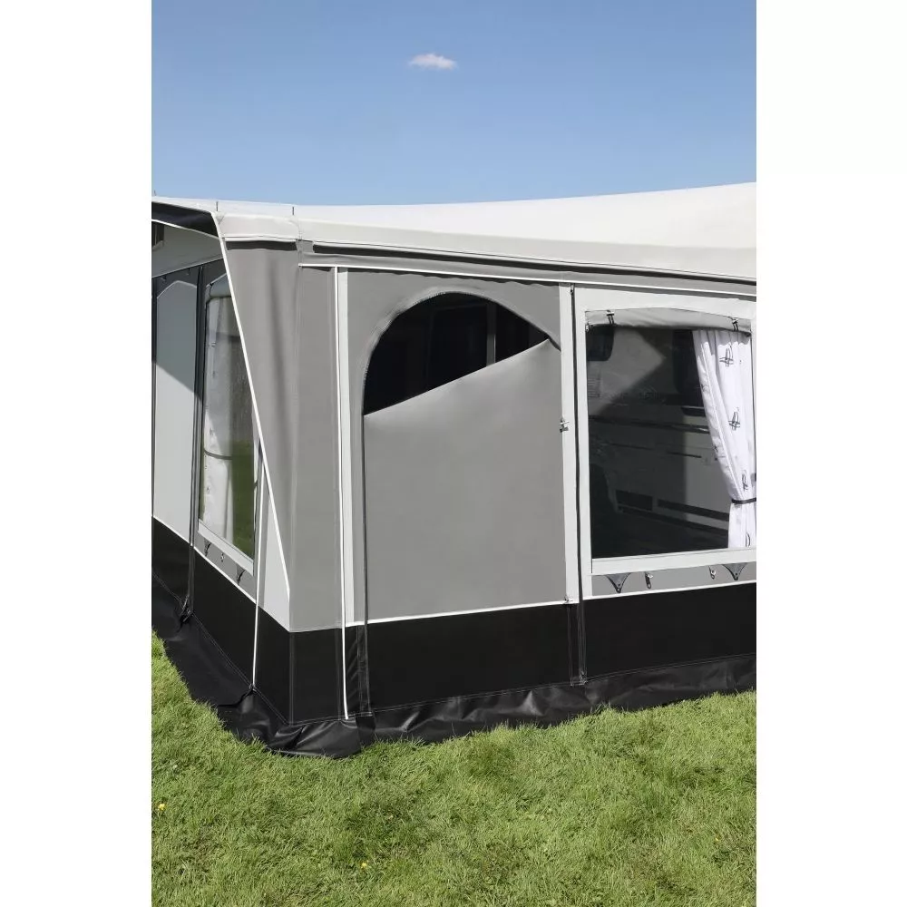 Die Vorderwandteile, betehend aus mehreren Fensterelementen und einem Türelement, sind bliebig gegeneinander tauschbar. So kannst du die Eingangsposition in dein Vorzelt selbst festlegen. Die grossen Fenster lassen viel Licht ins Innere. In Kombination mit den mitgelieferten Gardinen ist für ein angenehmes Wohngefühl gesorgt. Wenn du mal länger unterwegs bist oder keine Blicke ins Innere wünschst, kannst du die Fenster einfach mit den Fensterklappen blickdicht verschliessen. Besonders praktisch und nützlich sind die Fenster-Klappen an Tagen mit schlechterem Wetter. Zudem ist das Caravanvorzelt auf beiden Seiten mit einer praktischen, überdachten Allwetter-Belüftungsöffnung ausgestattet. Das robuste 32,0 x 1,5 mm Stahlrohrgestänge und die Vordachverstärkung gehören ebenfalls zur Serienausstattung.