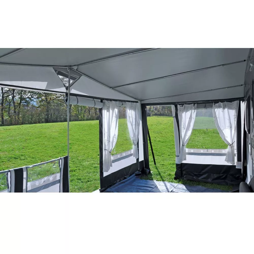 Das Wohnwagenvorzelt Hahn Zelte Finnland ist ein grosses Dauerstandvorzelt, bestehend aus robustem PVC-Gewebe. Es ist ideal fürs Ganzjahrescamping geeignet. Das leichte und dennoch starke Ø 25 mm Stahlgestänge (im Lieferumfang enthalten) lässt sich im Nu einziehen, so dass der Urlaub alsbald starten kann. Bei Wunsch kann es optional auch durch ein noch stärkeres Ø 32 mm Stahlgestänge ausgetauscht werden.