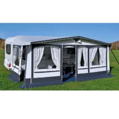 Das Wohnwagenvorzelt Hahn Zelte Finnland ist ein grosses Dauerstandvorzelt, bestehend aus robustem PVC-Gewebe. Es ist ideal fürs Ganzjahrescamping geeignet. Mit Tiefe von 280 cm hast du genügend Platz um mit deiner ganzen Familie einen entspannten Urlaub zu geniessen.Das leichte und dennoch starke Ø 25 mm Stahlgestänge (im Lieferumfang enthalten) lässt sich im Nu einziehen, so dass der Urlaub alsbald starten kann. Bei Wunsch kann es optional auch durch ein noch stärkeres Ø 32 mm Stahlgestänge ausgetauscht werden.