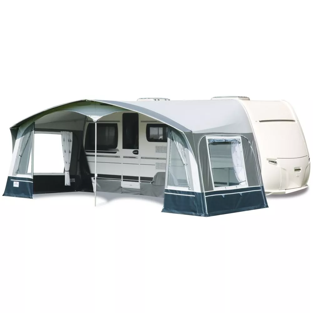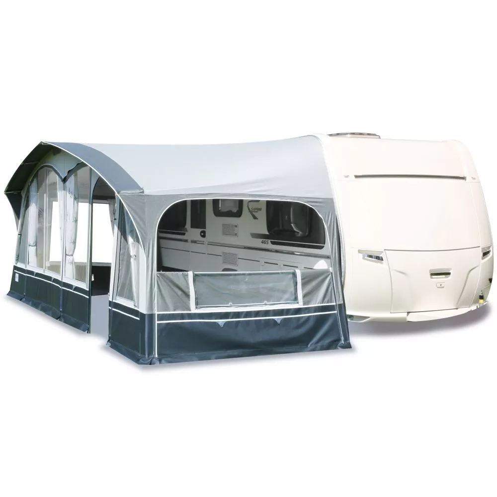 Wer auch an heissen Tagen nicht auf das Vorzelt verzichten möchte, entscheidet sich für das auf die Bogenform abgestimmte Vorzelt-Sonnendach Rondo (Zubehör). Es wird direkt am Vorzelt befestigt und spendet mit 235 cm Tiefe angenehmen Schatten.